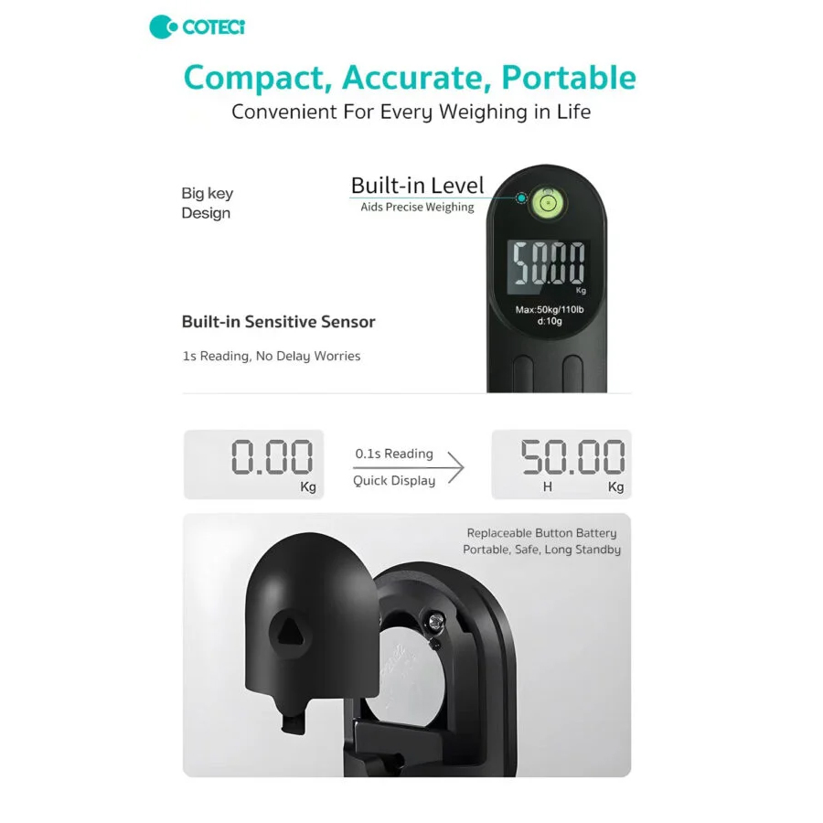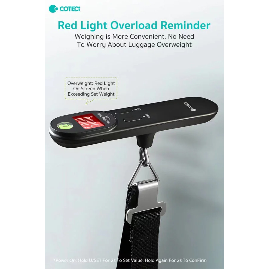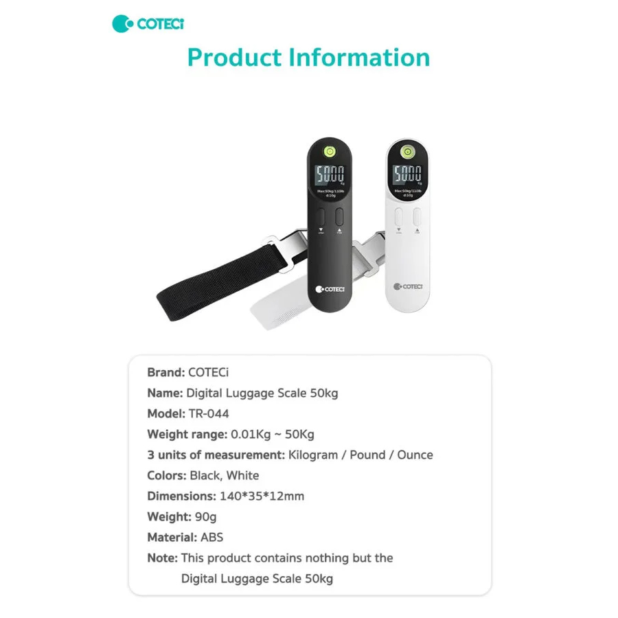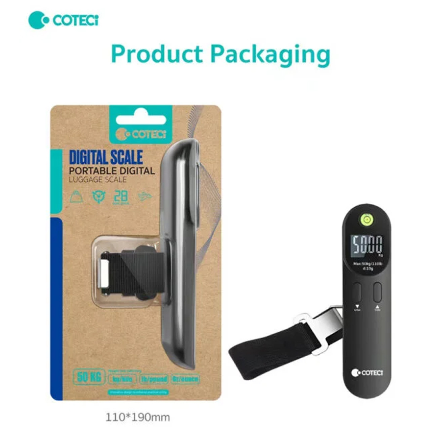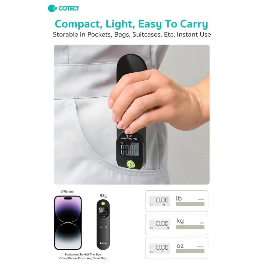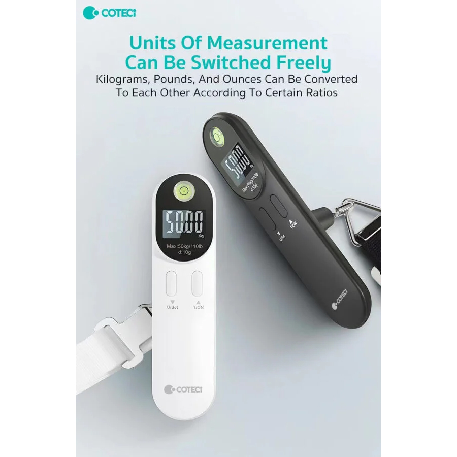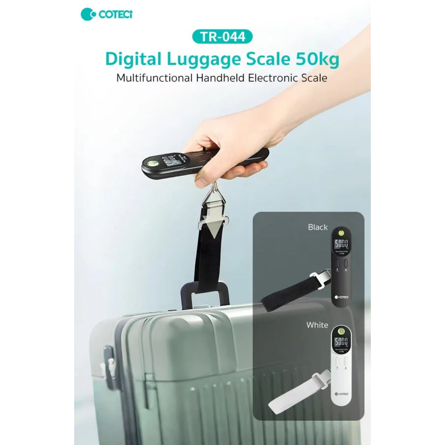 Digitalna vaga za prtljag COTEETCI TR-044-BK je kompaktan i praktičan alat za putovanja, namenjen preciznom merenju prtljaga do 50 kg. Poseduje ergonomski dizajn koji omogućava sigurno držanje, kao i jasan digitalni LCD ekran za lako očitavanje težine. Jednostavnim pritiskom dugmeta moguće je brzo menjati merne jedinice između kilograma (kg) i funti (lb).